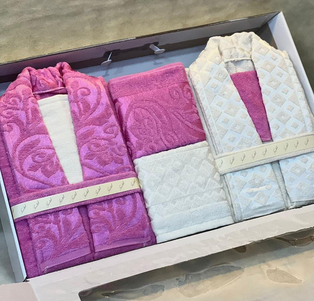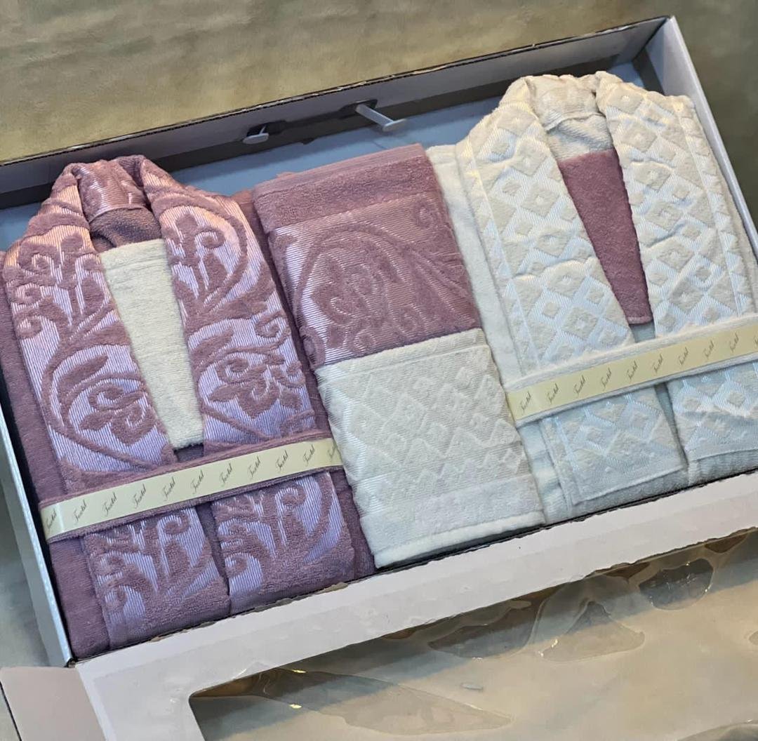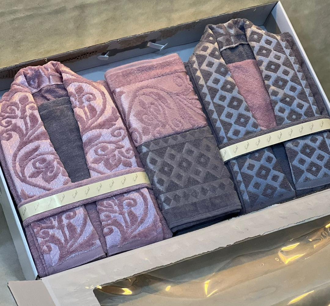 Jacquard double bathrobe set, 8 pieces.Available in 10 colors.Includes: 2 bathrobes, 2 face towels, 2 bath mats, and 2 loofahs