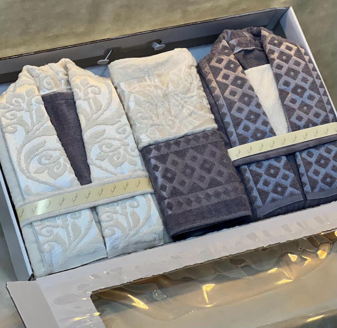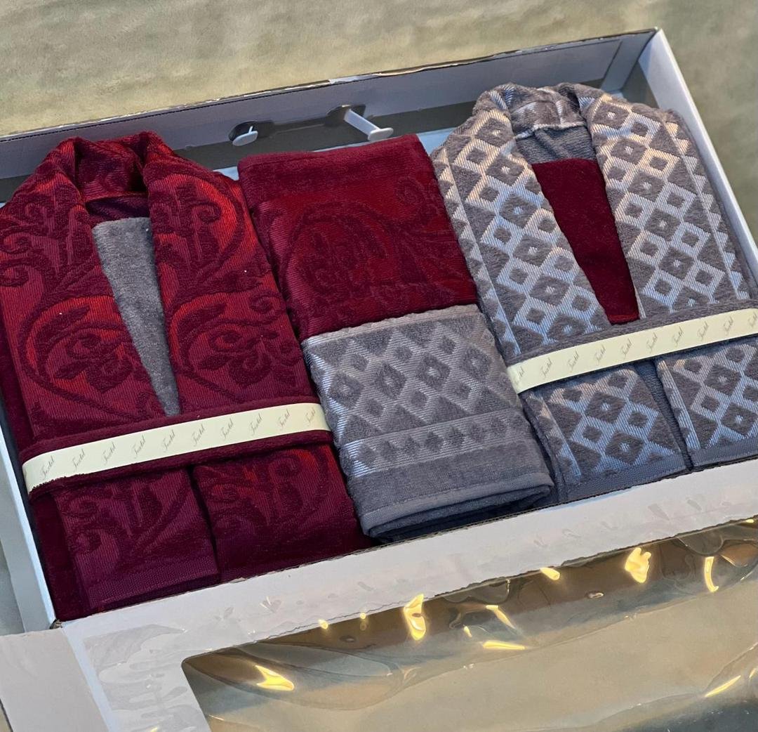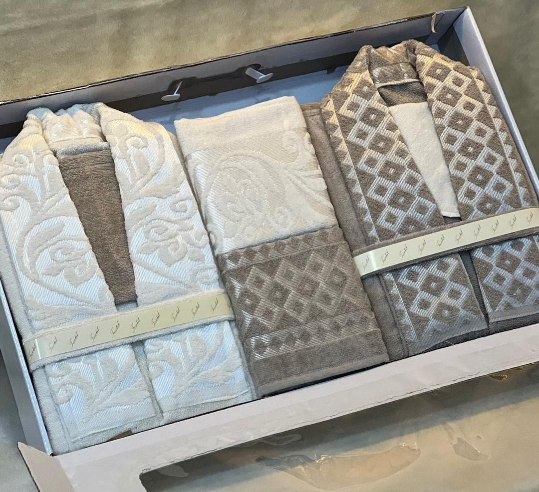 Jacquard double bathrobe set, 8 pieces.Available in 10 colors.Includes: 2 bathrobes, 2 face towels, 2 bath mats, and 2 loofahs