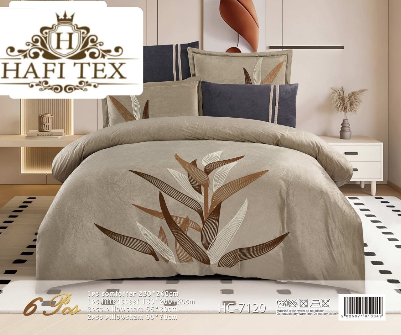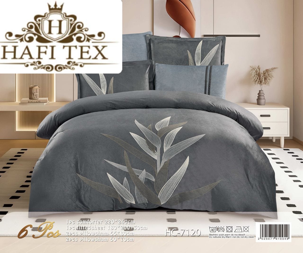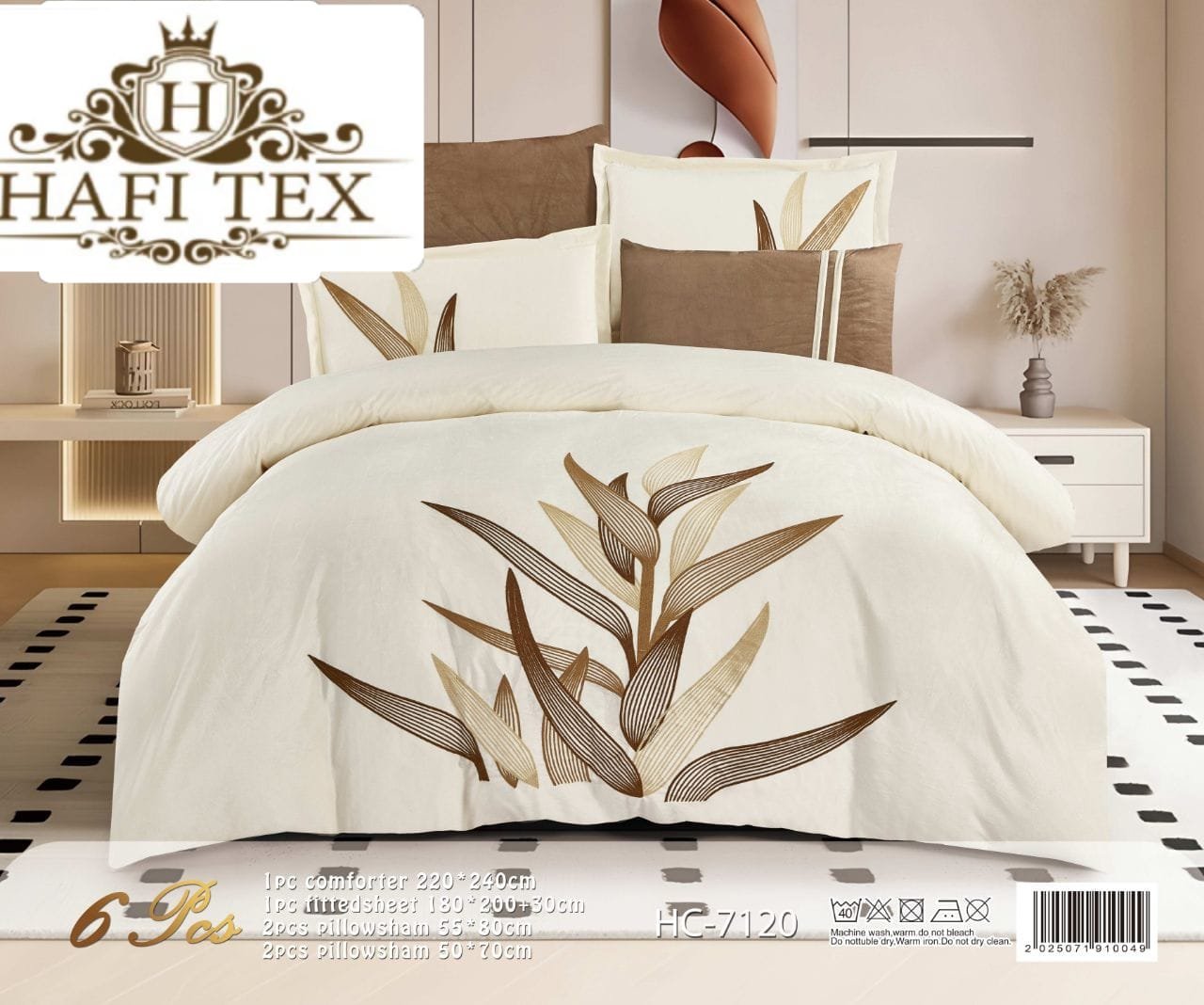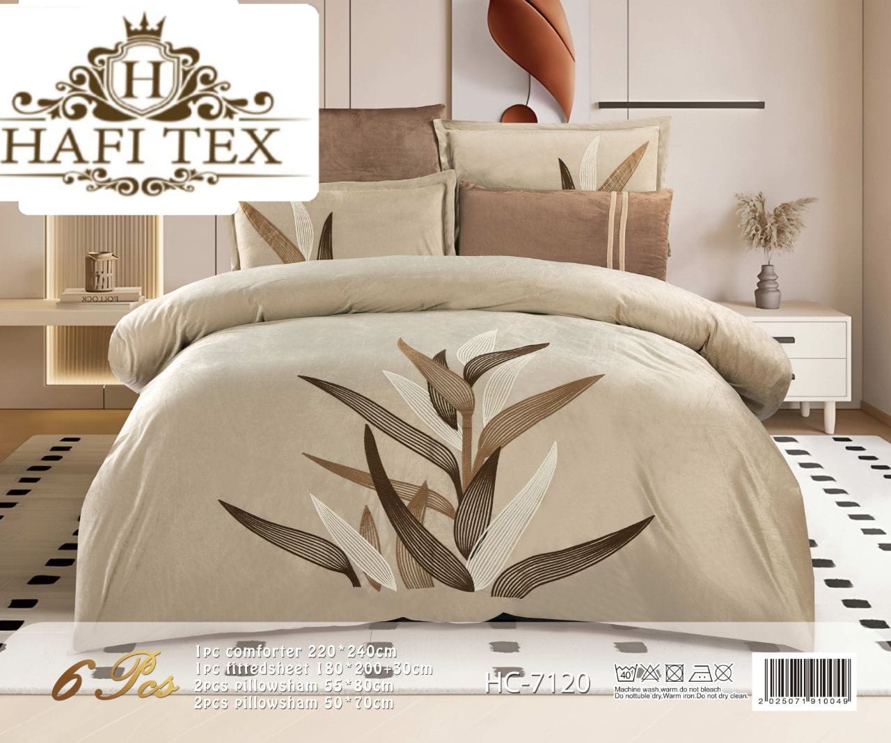 The set consists of 6 pieces, featuring the wheat-ear design.1 × Comforter (240 × 220 cm)1 × Fitted sheet4 × Pillowcases