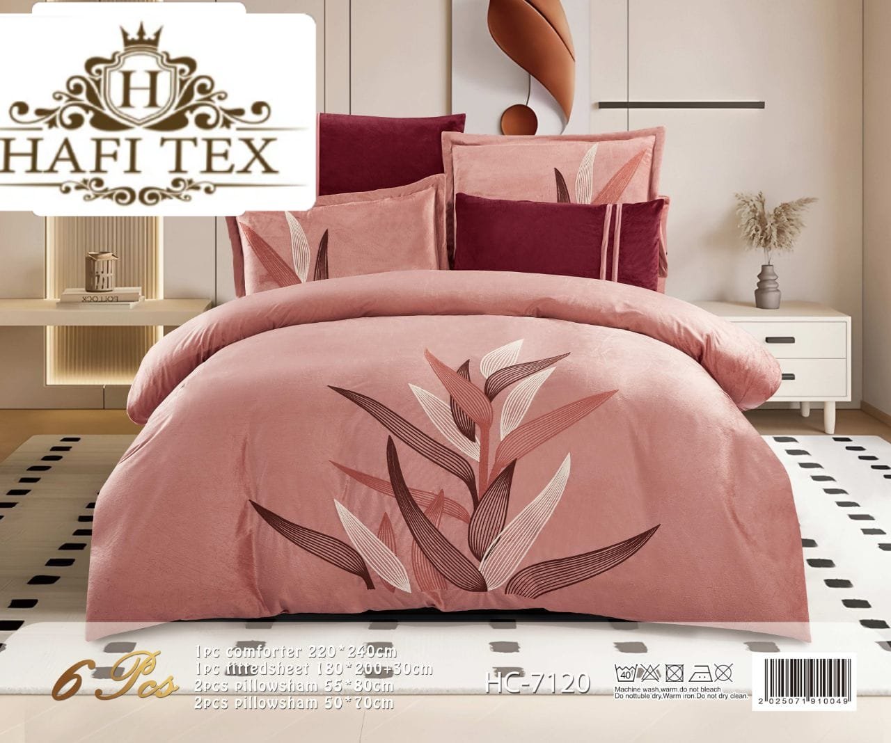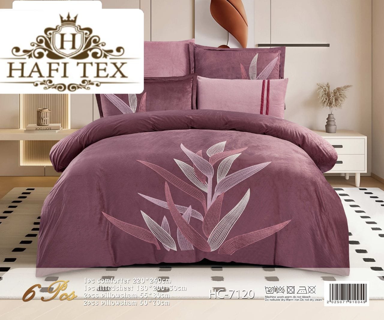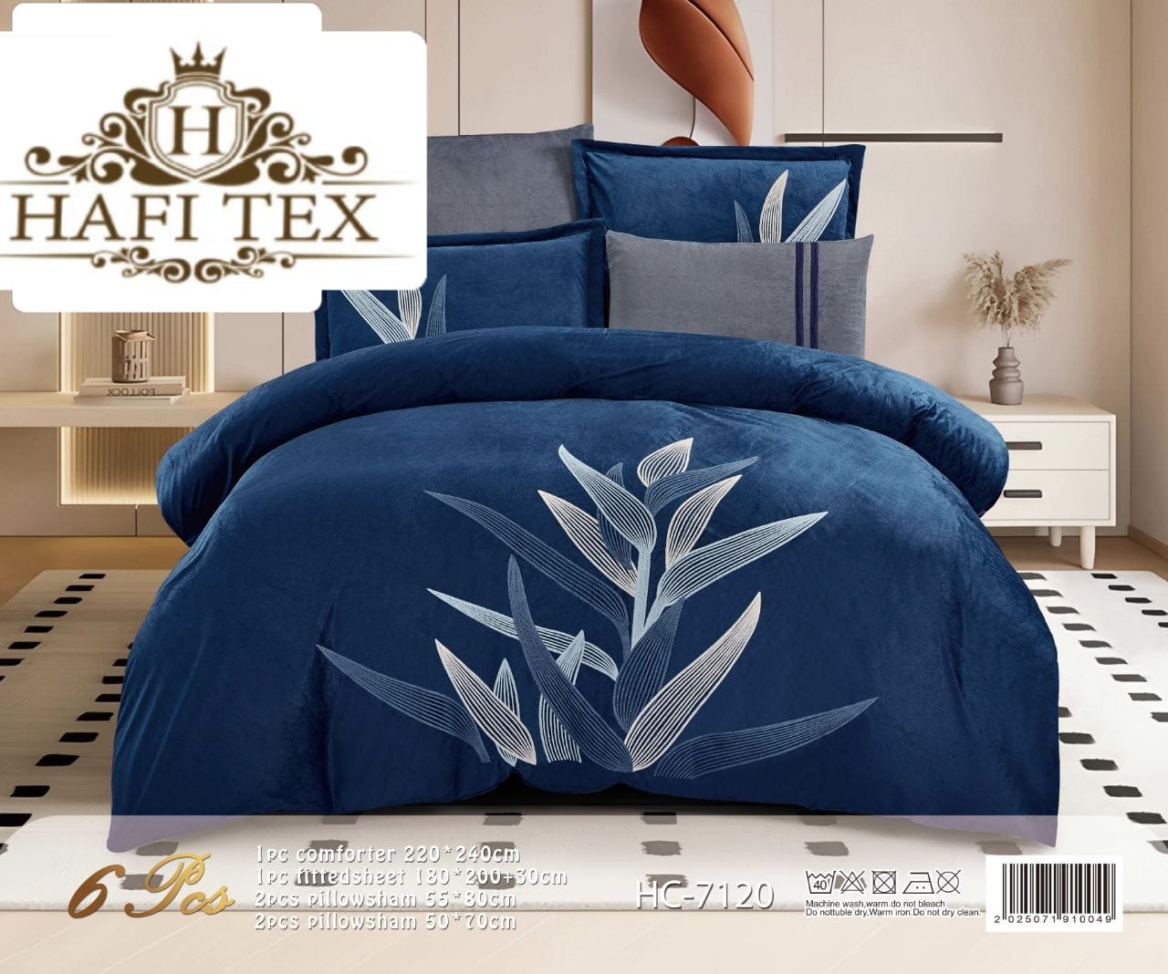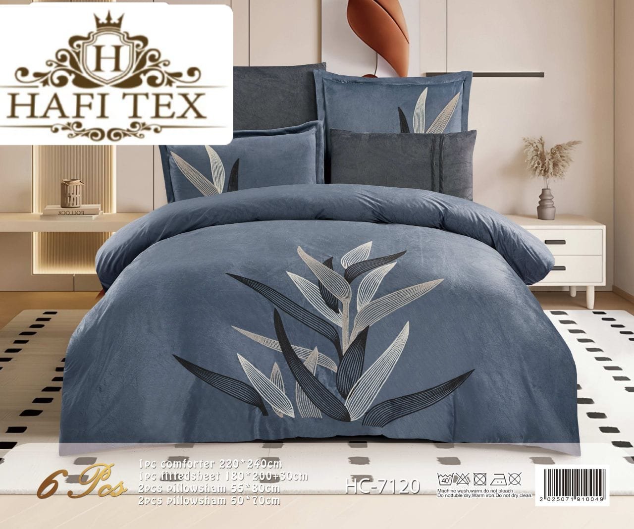 The set consists of 6 pieces, featuring the wheat-ear design.1 × Comforter (240 × 220 cm)1 × Fitted sheet4 × Pillowcases